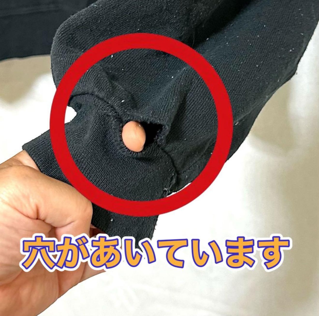 洗濯タグ無し。襟元のタグ穴あき。フードの紐無し。