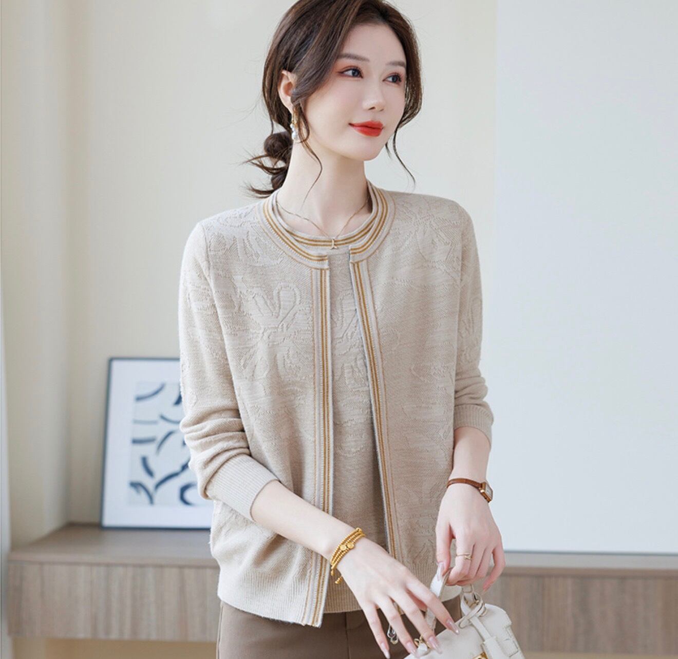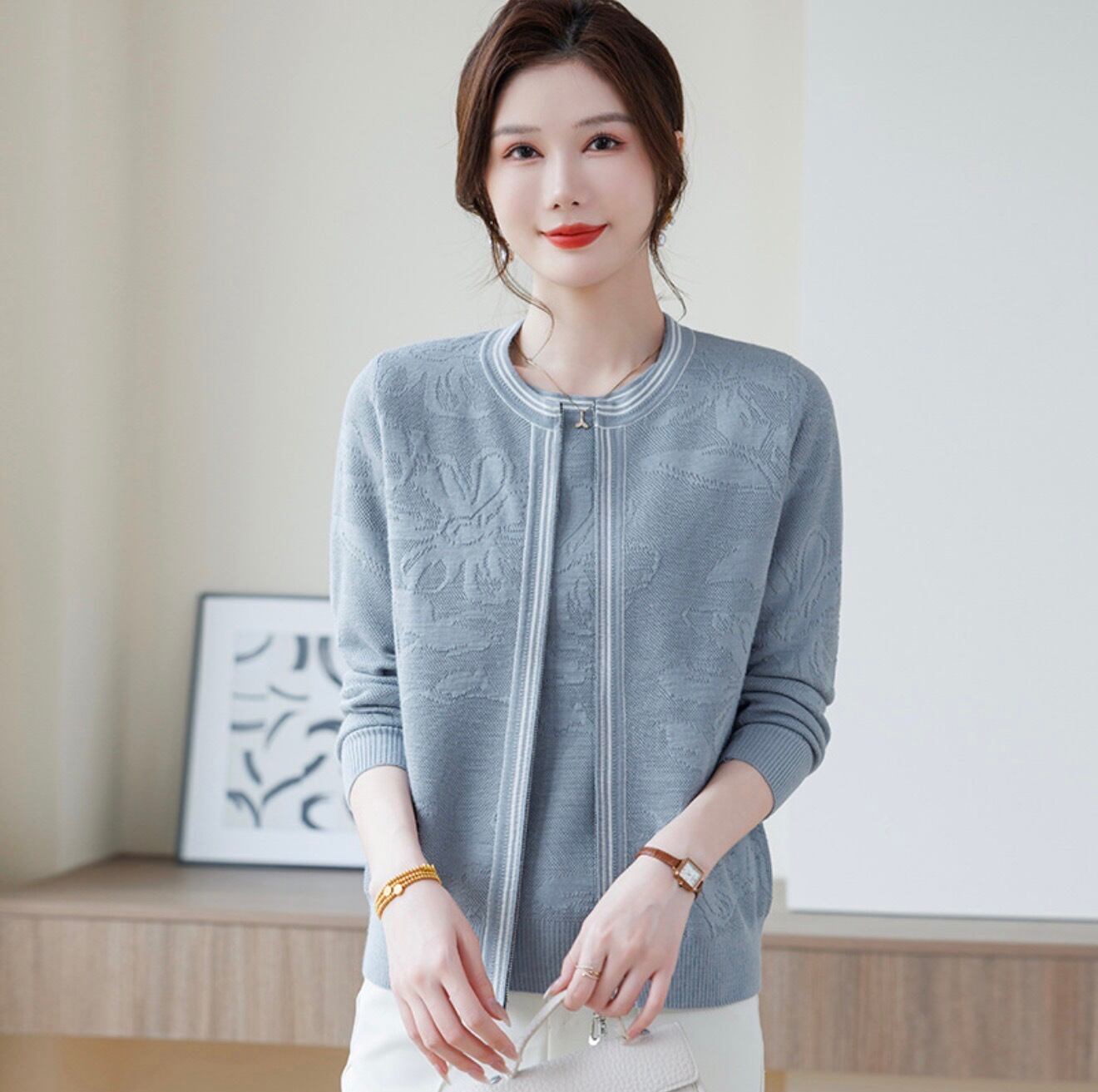 繊細な編み柄と縦ラインのデザインが、すっきりとしたシルエットを演出します。