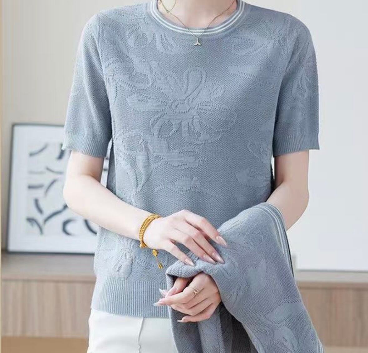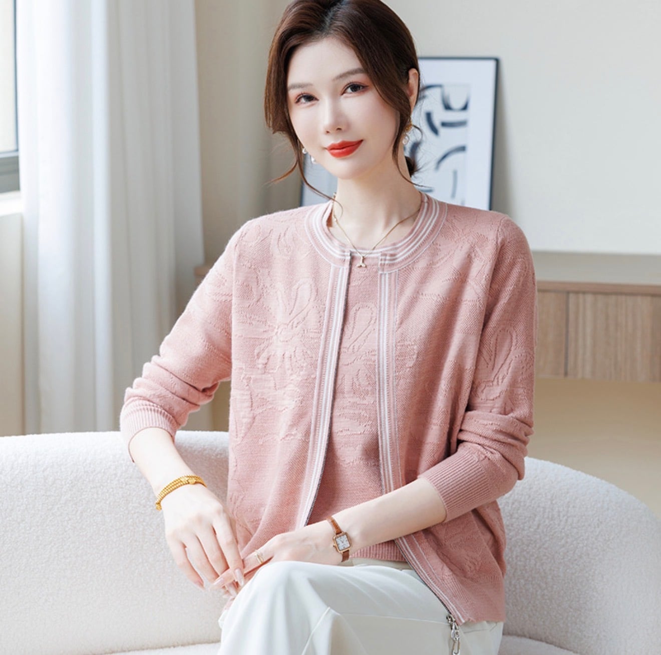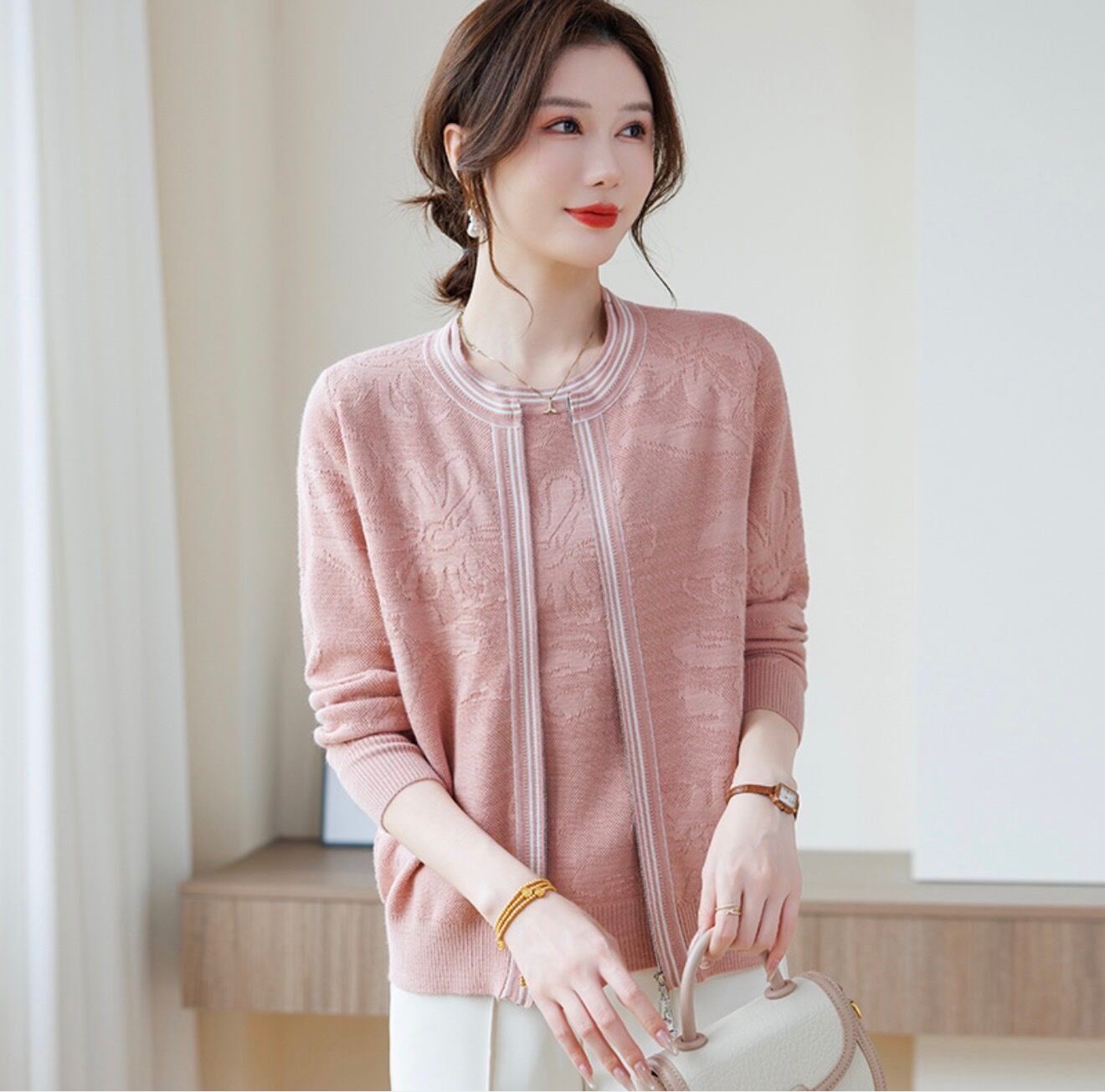 大人フェミニン 編み柄ニットトップス ピンク/ブルー/ベージュ M L XL 新品