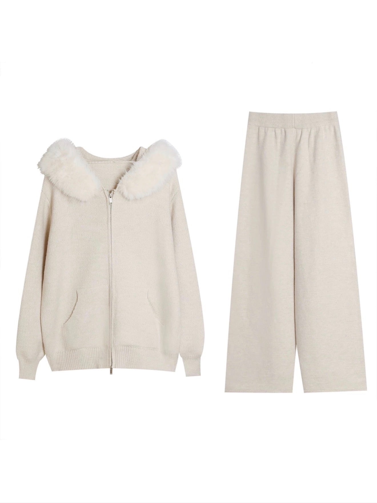 オシャレファーフード付きニットパンツセットアップ レディース 3色